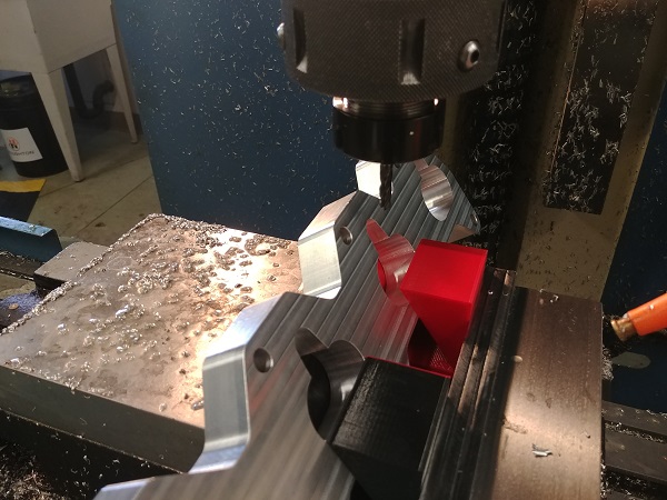 I picked up three pieces of metal, one for me, one as a trial just incase I made a mistake and the last one for if someone wants to buy one (helps to cover the cost of material and tools). I started out by clocking the vice parallel to the bed of the mill, and then clocked the piece of metal flat. I set the mills geometry and then proceeded to drill four holes central to the ports.