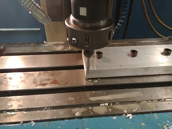 I made some steel spacers that will stand off the plate from the bed of the mill. I made the diameter of the spacers as large as possible in order to keep it rigid. I then set the mills geometry / work offset.